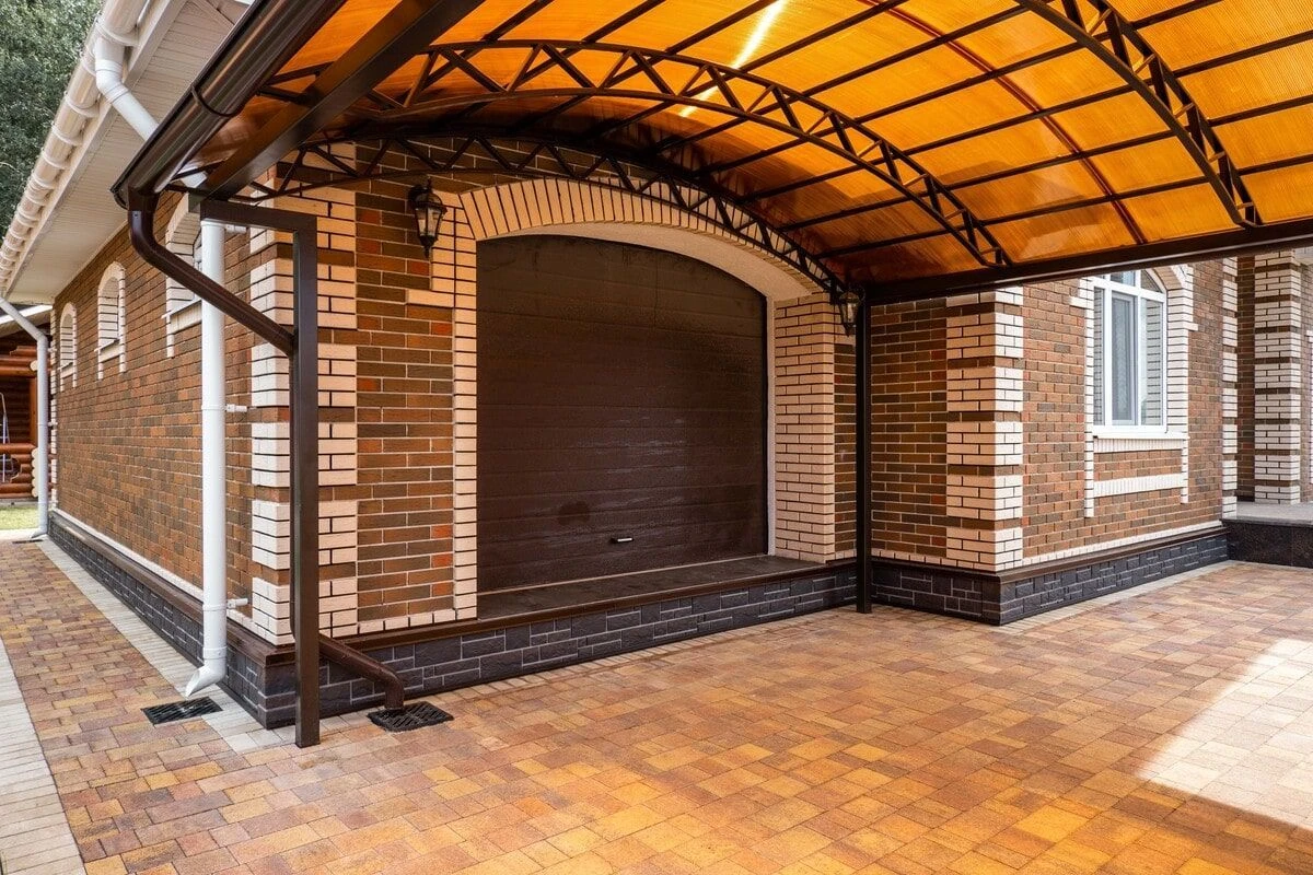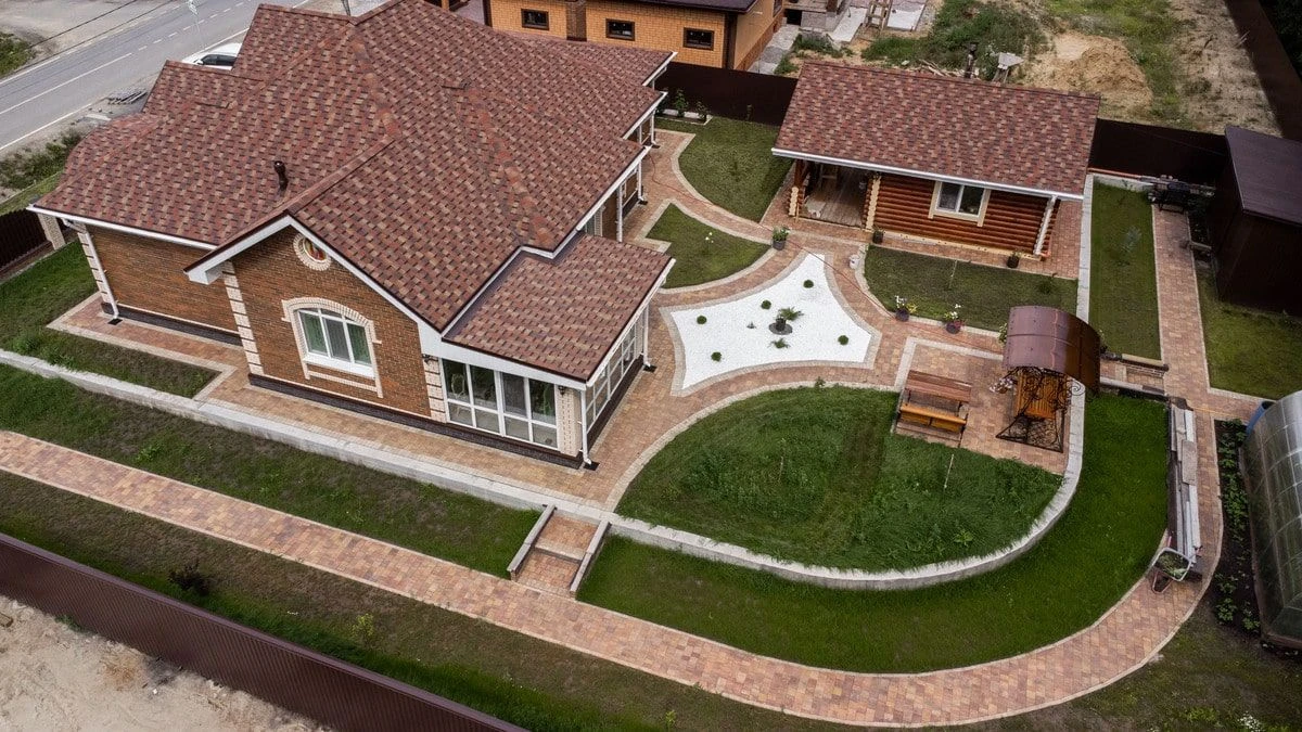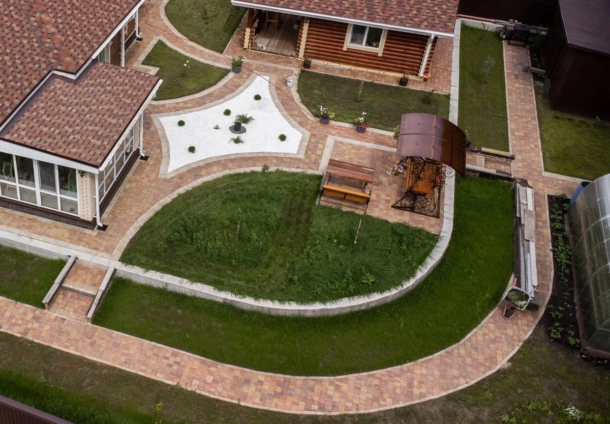 Классическое стилевое решение с сочетающимися между собой блоками позволило благоустроить территорию вокруг дома таким образом, чтобы не оттенять его дизайн, а дополнять архитектурные решения.