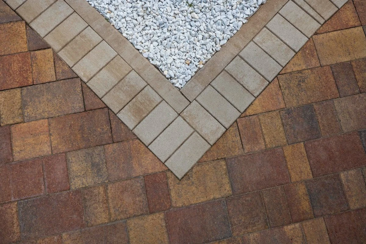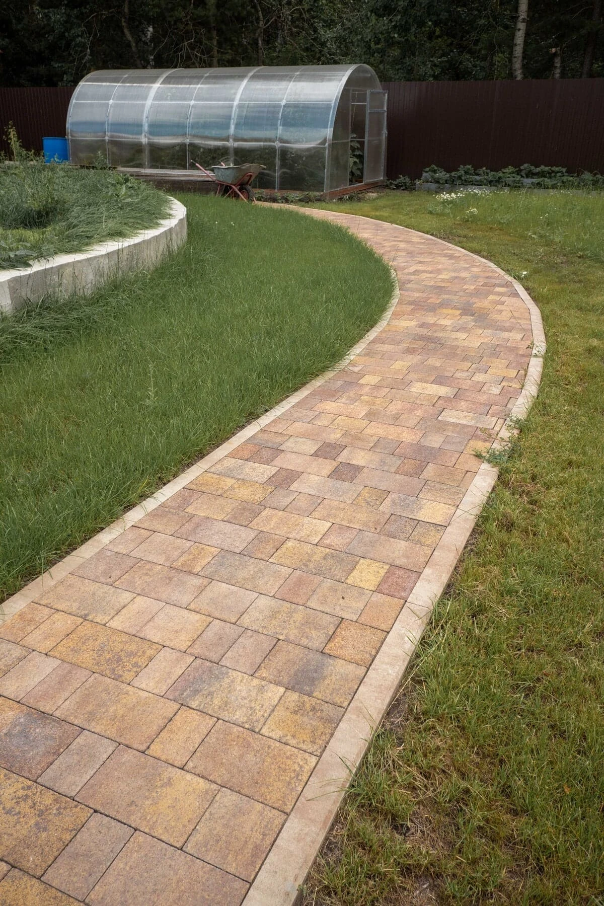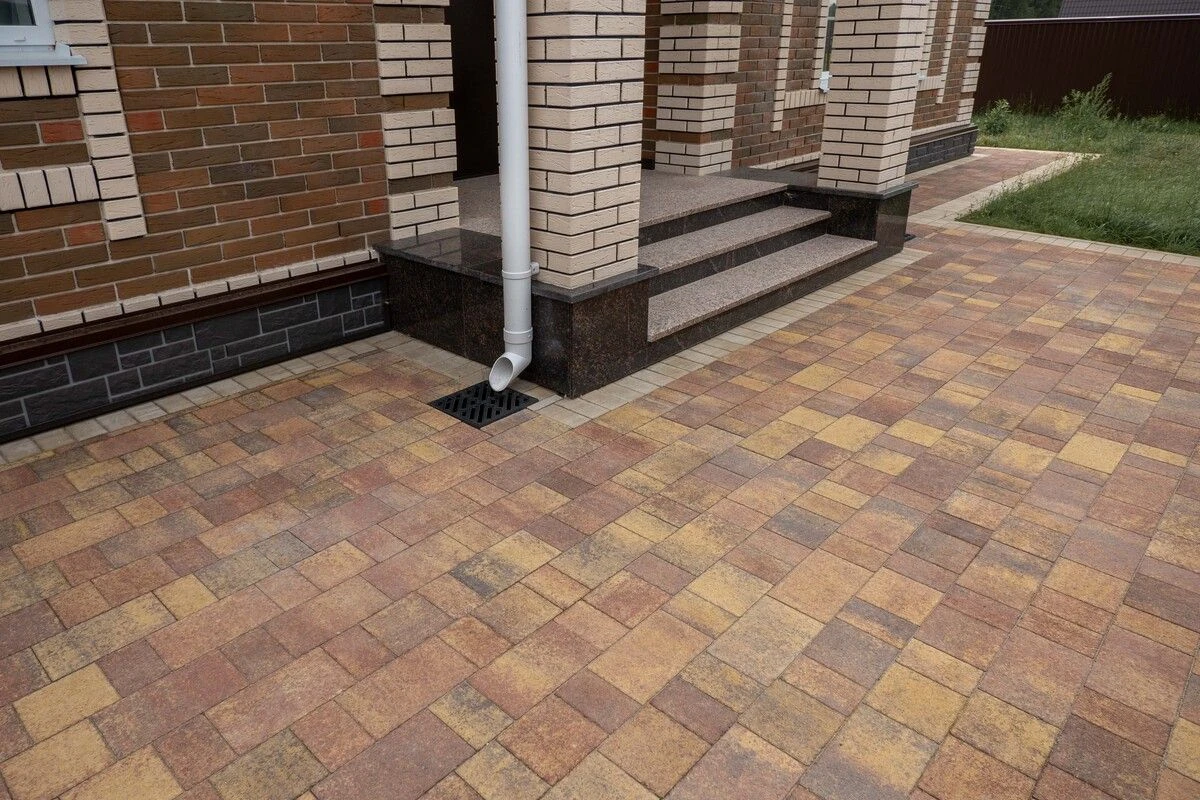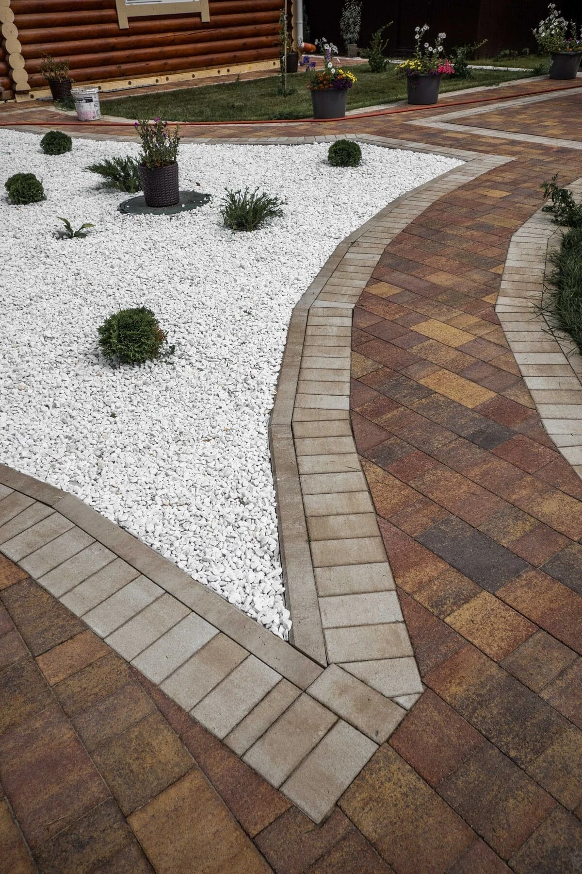 Мощение выполнено двумя тротуарными плитками от завода «Поревит»: «Старый город» в цвете Осень и «Прямоугольник» в цвете Степняк. Для оформления бордюров цвет «Степняк». Все товары представлены ниже и доступны для покупки.