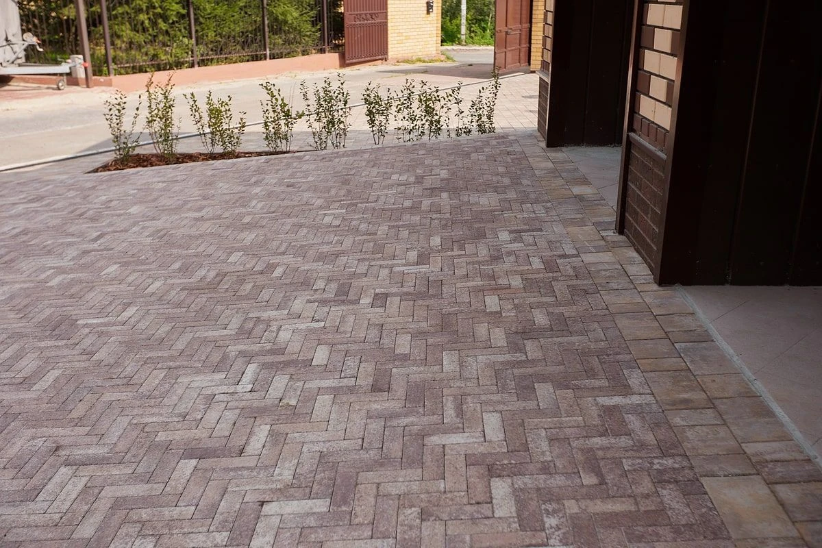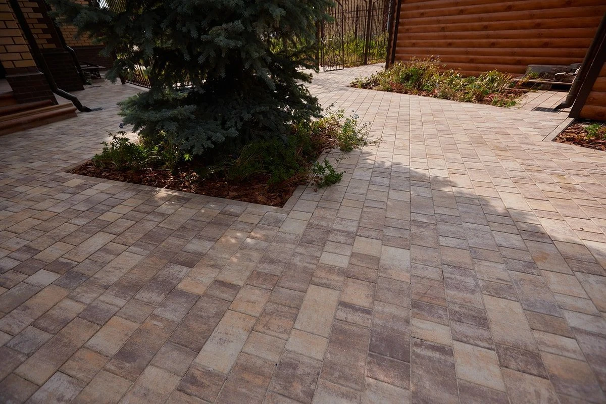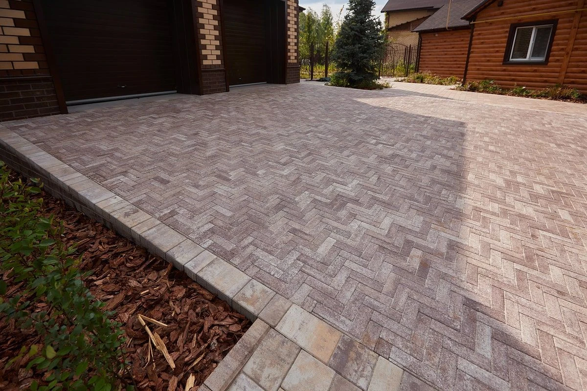 Ландшафтный дизайн участка с укладкой плитки Старый город и Паркет 180х60 в Тюмени