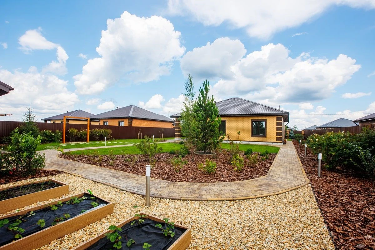 Выполнено мульчирование открытых поверхностей земли с помощью коры лиственницы. Это не позволяет расти сорнякам и служит декоративным покрытием. Пошаговые дорожки из крупноформатной плитки Литос придают участку эко-стиль и легкости. Сейчас шаговые дорожки в саду очень востребованы.