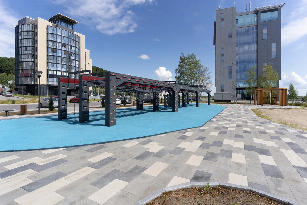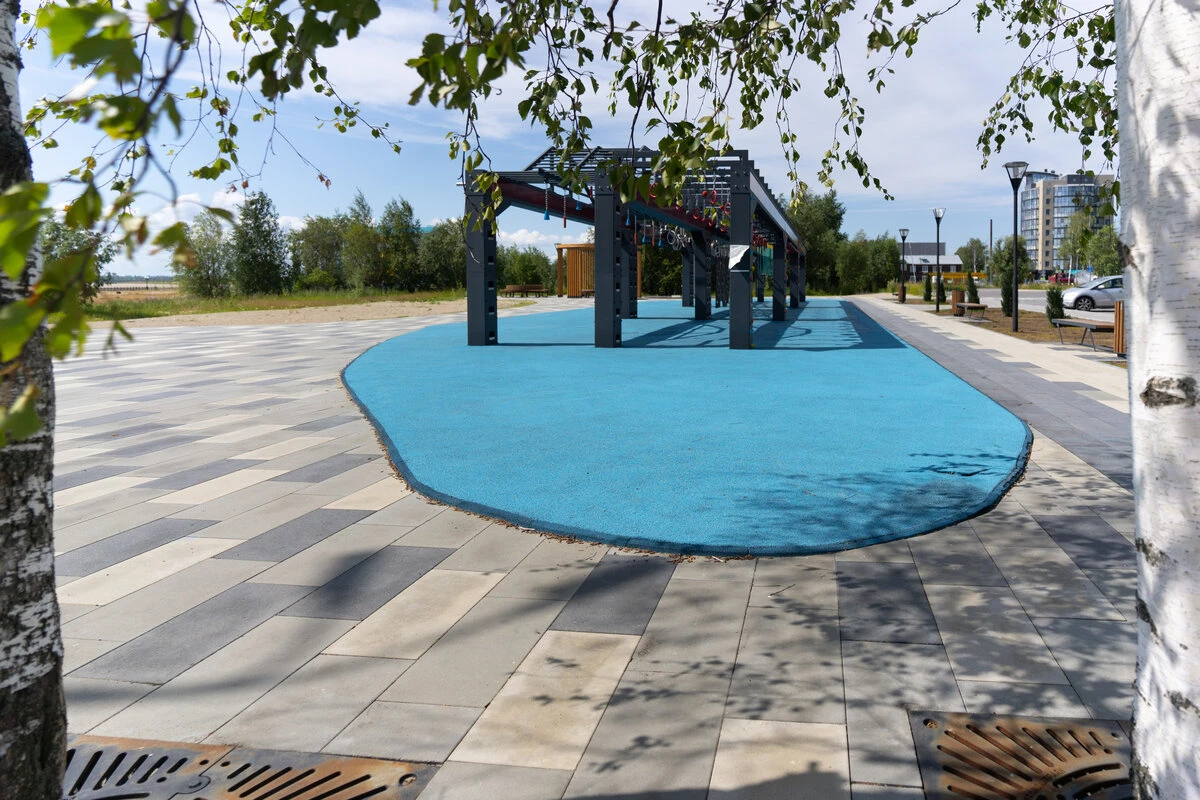 • При этом общая часть с качелями, деревьями и спортивными комплексами выложена в смешанном порядке трех цветов. Это визуально показывает общность пространства — каждый там может найти занятие по душе, даже если они абсолютно разные.