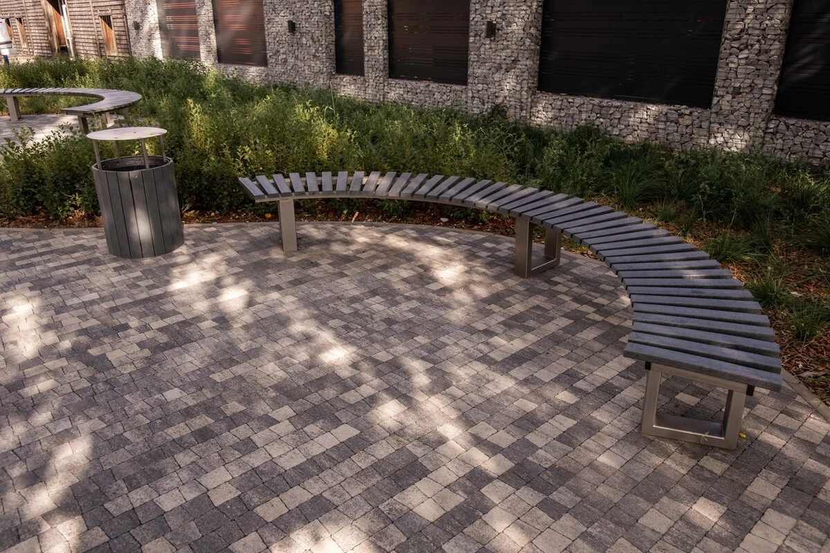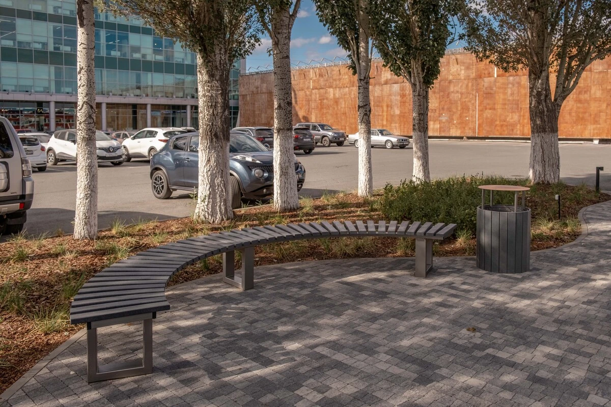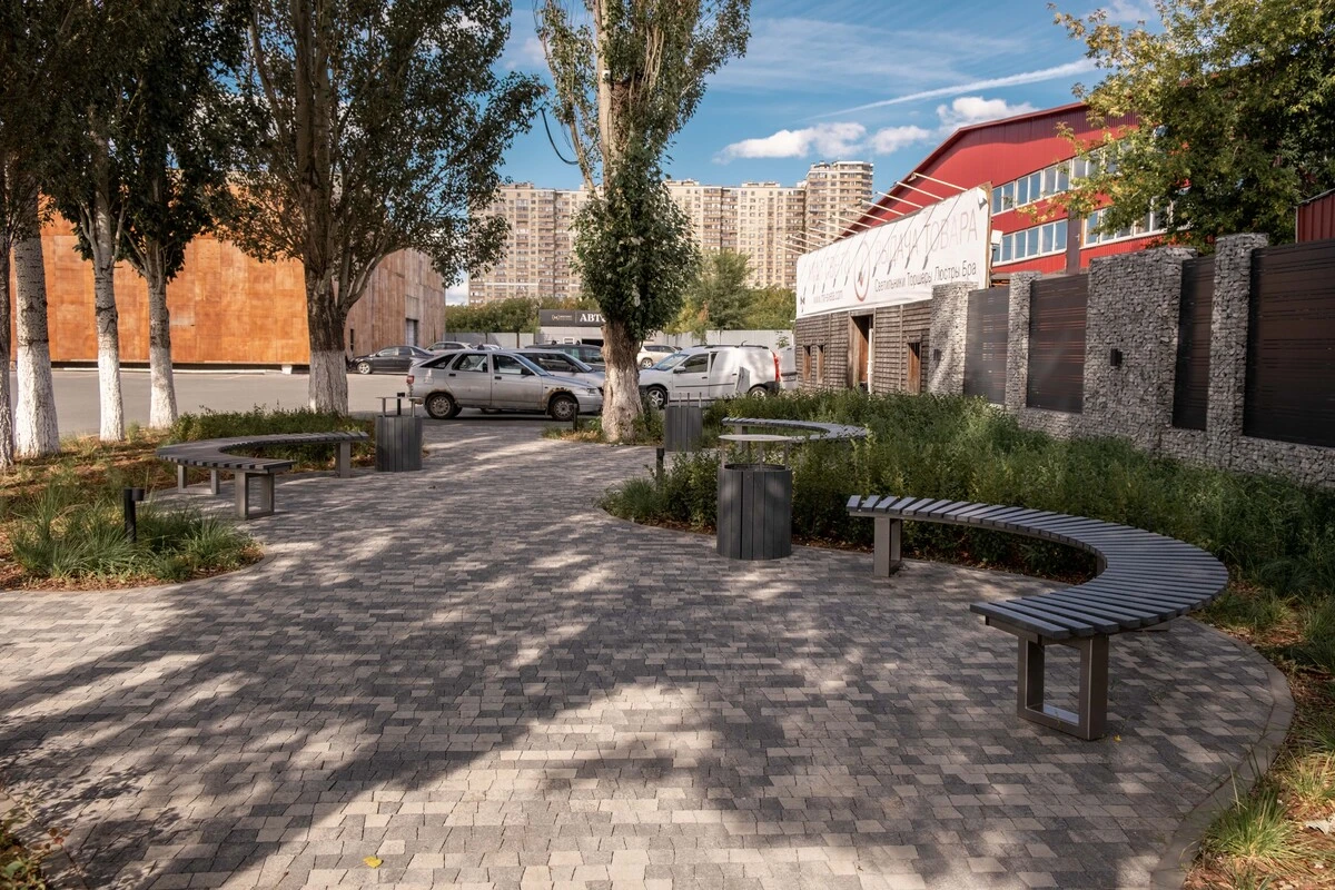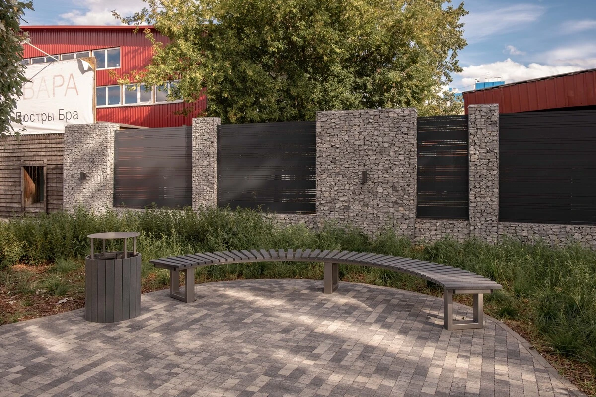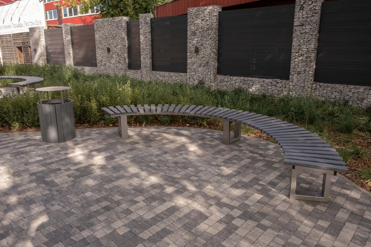 Для оформления территории использована тротуарная плитка «Поревит» Абрис, Листопад Гранит, Антрацит и радиусные бордюры серого цвета. Плитка градиентного черно-белого цвета уложена методом пяти поддонов для равномерного распределения без цветовых пятен. Далее после создания дорожек были установлены скамейки и урны, которые дополнили пространство.