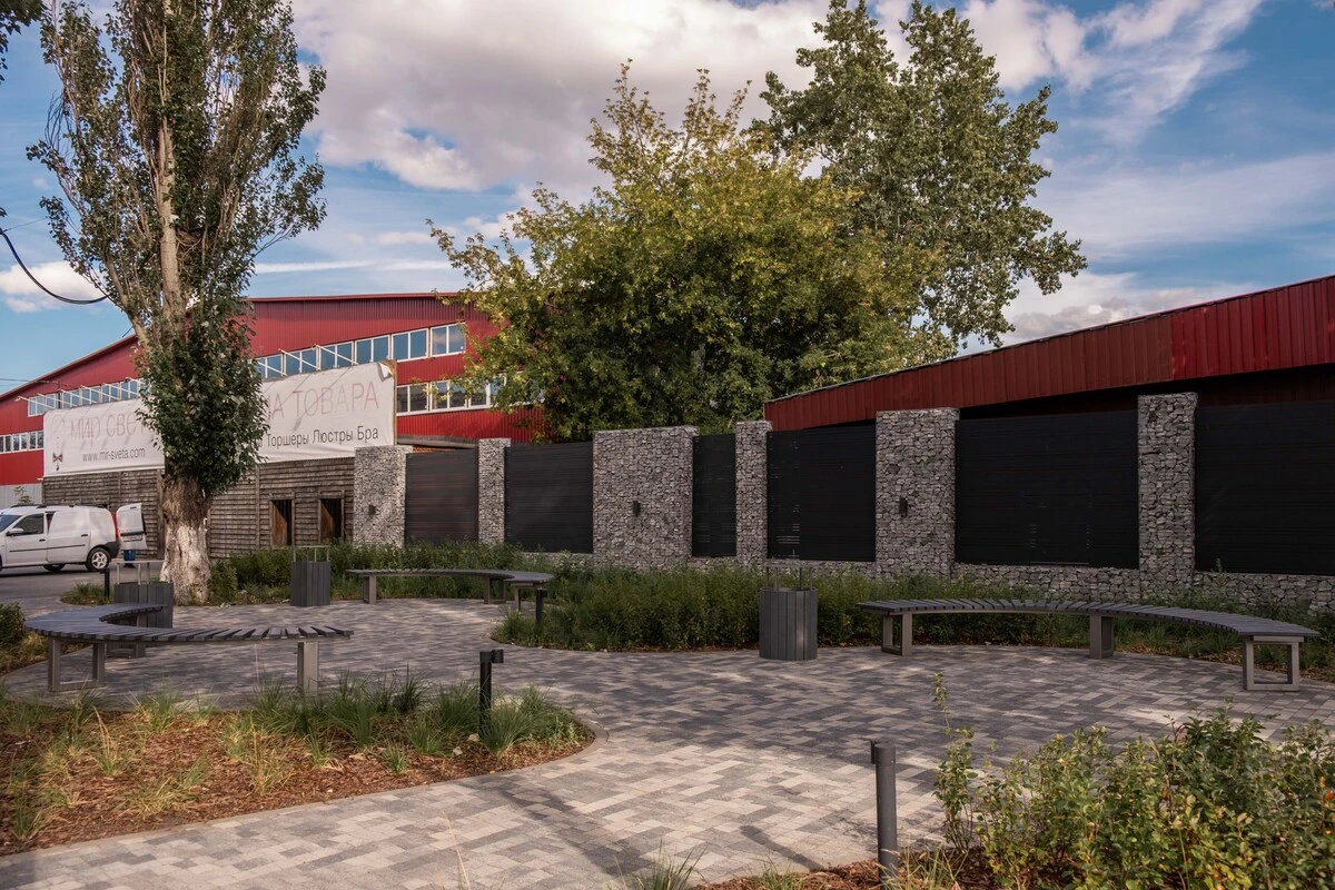 Территория рядом с парковочной зоной у ТЦ Новый Магнат относится к городским проектам. Учитывая особенности инфраструктуры, текущей архитектуры и общего стиля, подобранная тротуарная плитка стала отличным дополнением к проекту. Особенно хорошо сочетается она с габионами (заборы из металлической сетки, заполненные щебнем). Деревья создают дополнительную тень для отдыха, защищая от солнца.