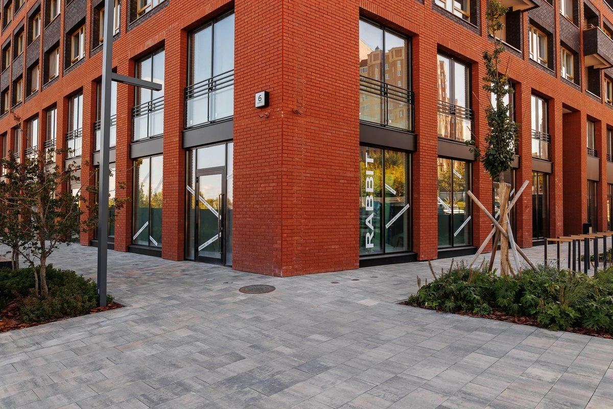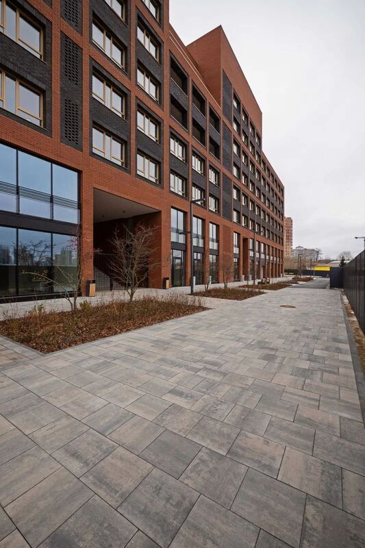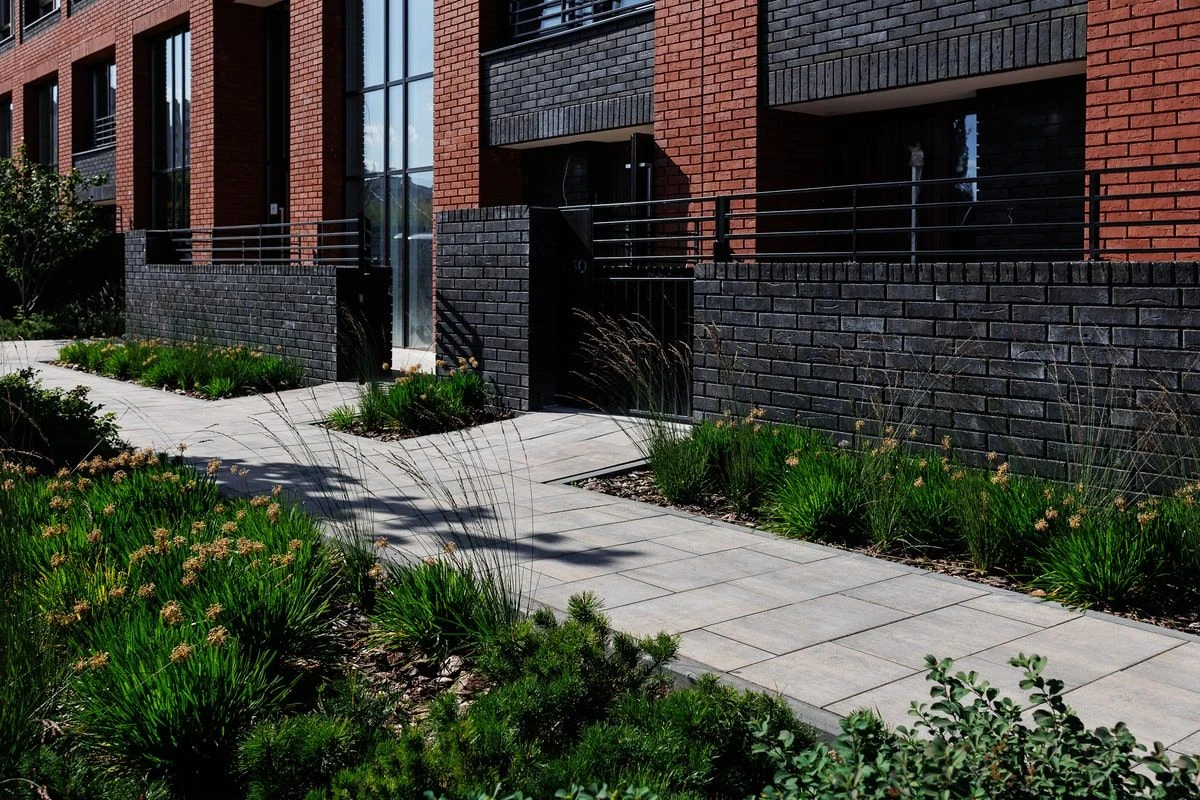 Тротуарная плитка «Поревит» в жилом комплексе «Речной порт» выступает в качестве дорожно-тропиночной сети по всему периметру ЖК, а также на территории во дворах и лестничных спусках-подъемах.