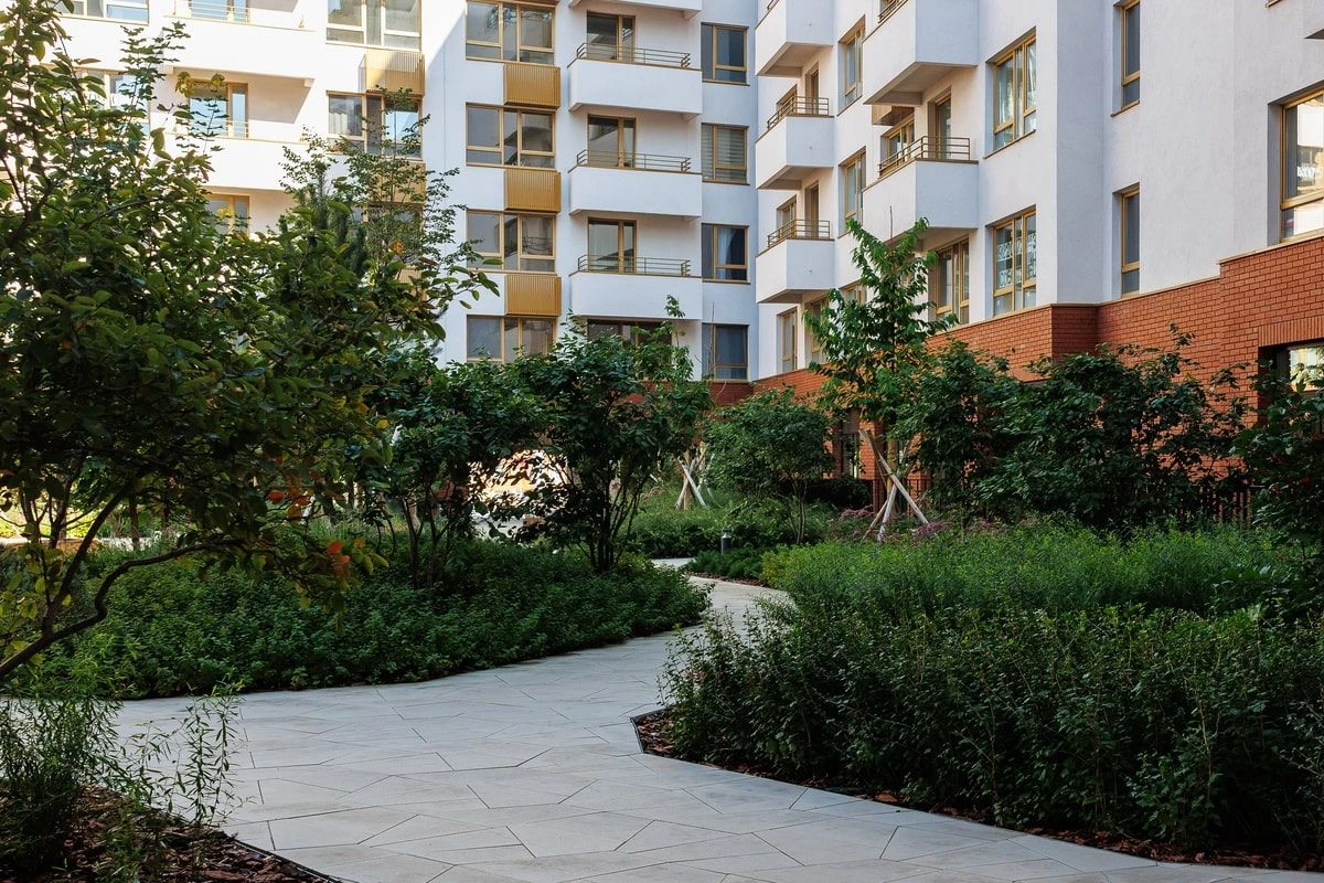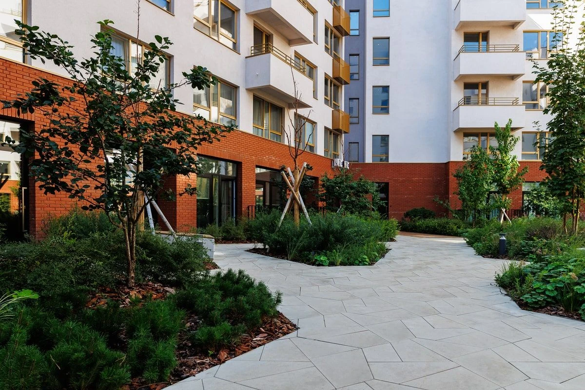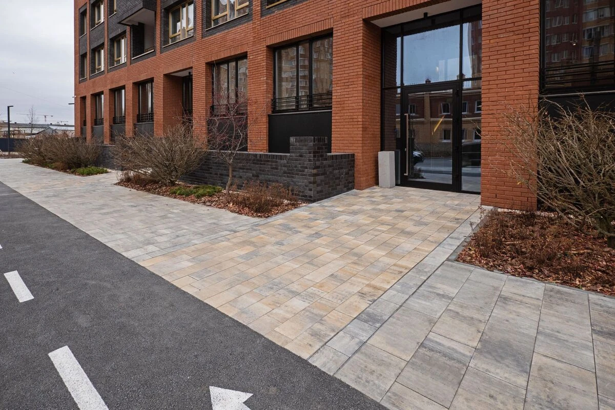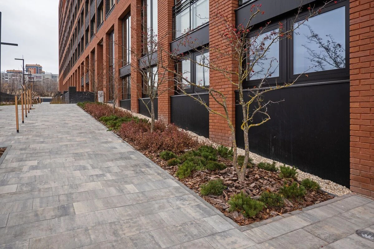 Нестандартный подход к кладке позволил создать уникальный дизайн при обустройстве комплекса. Строителям удалось сохранить минималистичный дизайн, который умело дополняется рисунками на плитах. Так рядом с асфальтированными велодорожками дорожками уложили тротуарную плитку «Прямоугольник» цвета Шунгит, визуально разделив две части дорожек для прохожих. Территория внутри дворов уложена белой плиткой «Мозаика» и «Квадрат» — разные формы также визуально отделяют дорожки друг от друга, но добавляют нестандартное видение пространству в совокупности с большой долей озеленения территории.