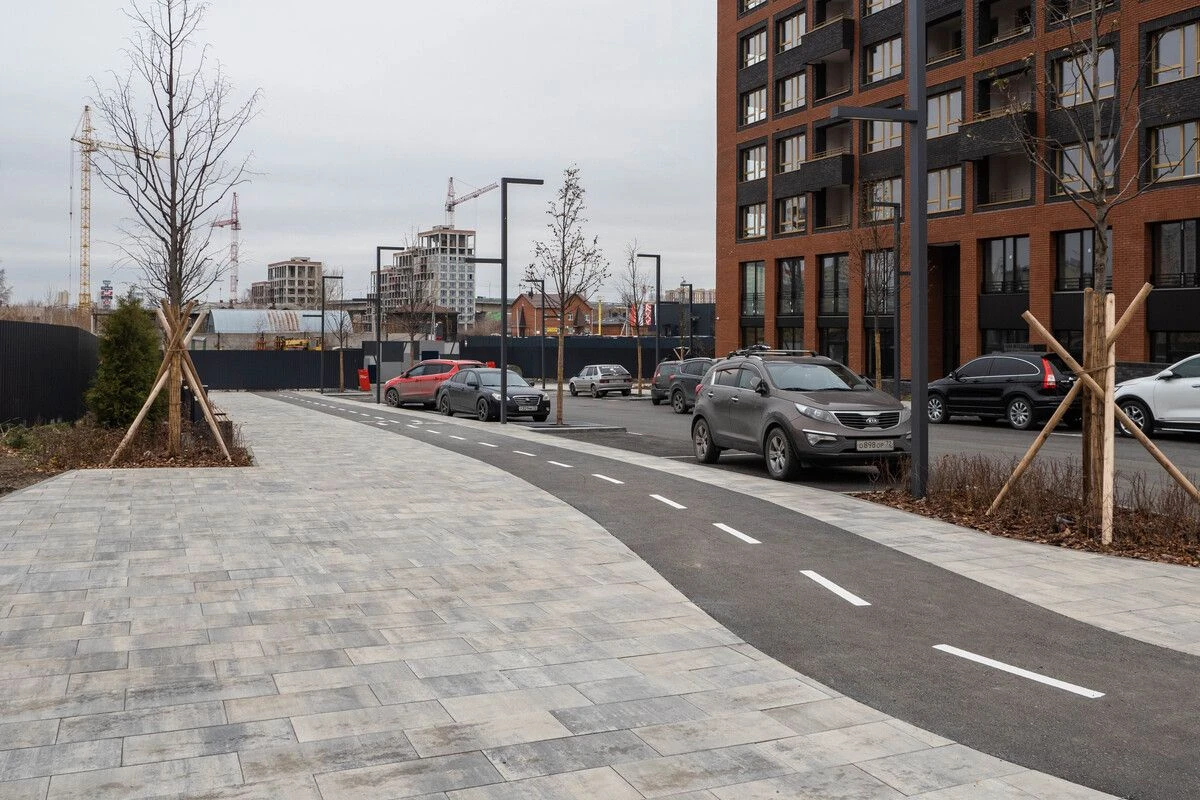 Частично применяется асфальтовое покрытие для велосипедов. Зона входных групп в подъезд и другая часть дорожек вокруг ЖК различается плиткой разных цветов. Таким образом выполнено функциональное разделение-зонирование. В качестве бордюров используются и бетонные бордюры и гибкие стальные. Также на этапе установки лавочек проведена следующая работа: бетонирования, затем укладка брусчастки и заполнение отверстий декоративными камнями.